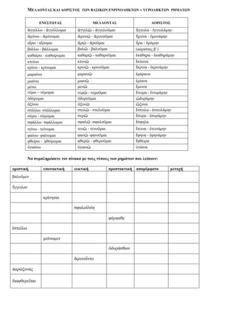 Ν ΒΑΣΙΚ Ν ΕΝΡΙΝΟΛΗΚΤ Ν – ΥΓΡΟΛΗΚΤ Ν ΡΗΜΑΤ Ν ΕΝΕΣΤ ΤΑΣ ΜΕΛΛΟΝΤΑΣ ΑΟΡΙΣΤΟΣ éγγέλλω - éγγέλλοµαι éµύνω - éµύνοµαι éγγελ« - éγγελο˵αι éµυν« - éµυνο˵αι ≥γγειλα - ±γγειλάµην ≥µυνα - ±µυνάµην α‡ρω - α‡ροµαι βάλλω - βάλλοµαι καθαίρω - καθαίροµαι κτείνω κρίνω - κρίνοµαι éρ« - éρο˵αι βαλ« - βαλο˵αι καθαρ« - καθαρο˵αι κτεν« κριν« - κρινο˵αι ∑ρα - ±ράµην (αόριστος β΄) §κάθηρα - §καθηράµην ®κτεινα ¶κρινα - §κρινάµην µαραίνω µαραν« §µάρανα µιαίνω µένω νέµω – νέµοµαι Ùδύροµαι Ùξύνω στέλλω- στέλλοµαι σύρω - σύροµαι σφάλλω- σφάλλοµαι µιαν« µεν« ν嵫 - νεµο˵αι Ùδυρο˵αι Ùξυν« στελ« - στελο˵αι συρ« σφαλ« -σφαλο˵αι §µίανα ¶µεινα ¶νειµα - §νειµάµην »δυράµην Ãξυνα ¶στειλα - §στειλάµην ¶συρα - §συράµην ¶σφηλα τείνω - τείνοµαι τεν« - τενο˵αι ¶τεινα - §τεινάµην φαίνω- φαίνοµαι φθείρω - φθείροµαι Íγιαίνω φαν« -φανο˵αι φθερ« - φθερο˵αι Íγιαν« ¶φηνα - §φηνάµην ¶φθειρα Íγίανα Να συµπληρώσετε τον πίνακα µε τους τύπους των ρηµάτων που λείπουν: οριστική υποτακτική ευκτική προστακτική βαλο˵εν ≥γγειλαν κρίνηται σφαλο›/οίη φήνασθε §στείλω µείνωµεν Ùδυράσθων éµυνο›ντο παρώξυνας διαφθερε›ται απαρέµφατο µετοχή
