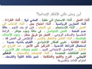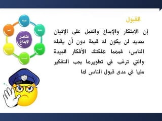 تتناول الوثيقة موضوع التفكير الإبداعي وأهميته في الريادة، مع التركيز على صفات الرياديين ودورهم في إحداث التغيير. كما تتطرق إلى مستوياته المختلفة وأنواع التفكير، بالإضافة إلى تقديم تعاريف حول كيفية تحقيق الإبداع في مختلف المجالات. يعرض النص أيضًا تجارب عملية وأمثلة توضح الفرق بين التفكير المنطقي والإبداعي.