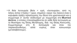 • Η θείαλειτουργία [θεία = ιερή, «λειτουργία», από τις