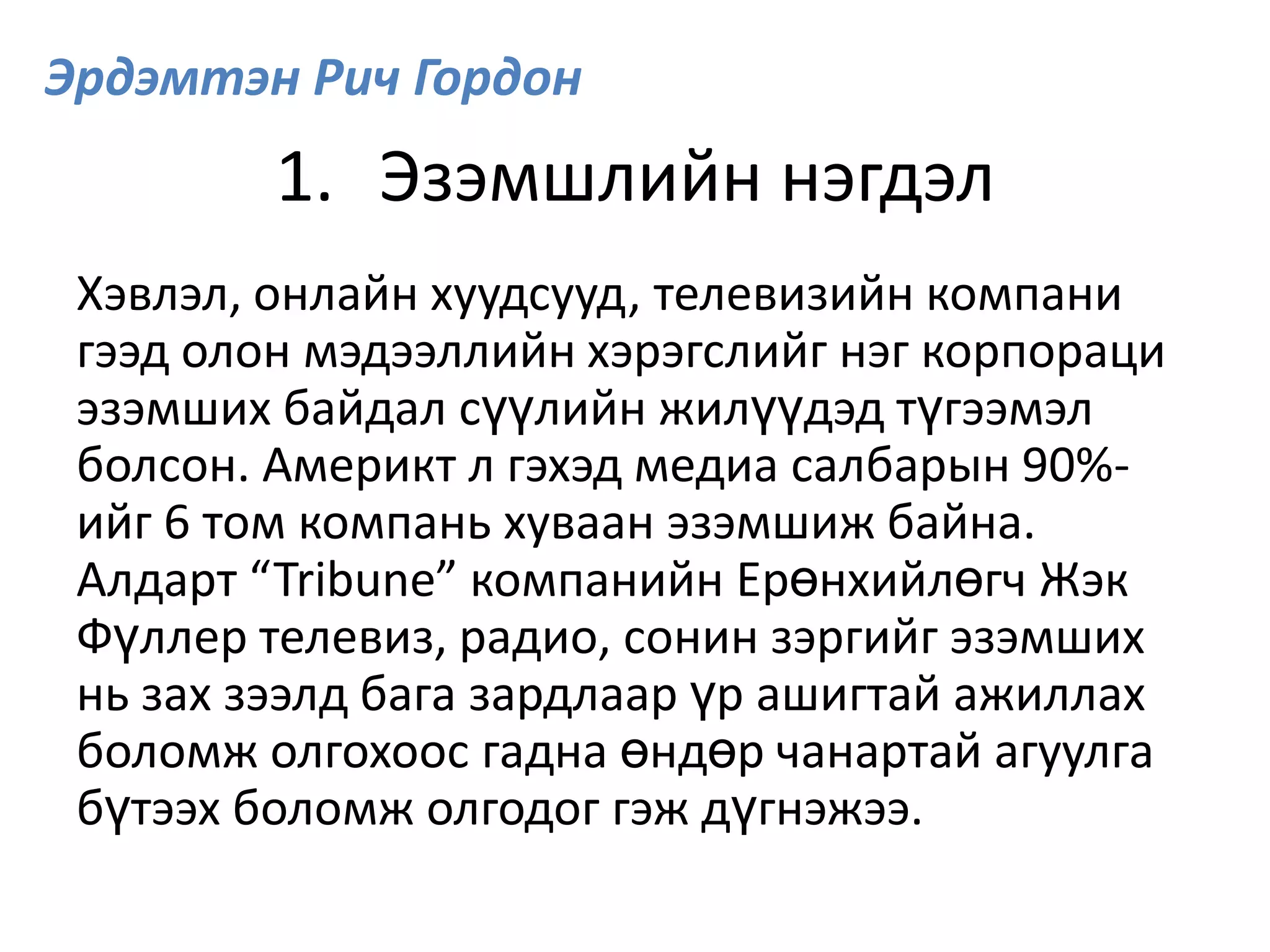 Эзэмшлийн нэгдэл Хэвлэл, онлайн хуудсууд, телевизийн компани гээд олон мэдээллийн хэрэгслийг нэг корпораци эзэмших байдал сүүлийн жилүүдэд түгээмэл болсон. Америкт л гэхэд медиа салбарын 90%ийг 6 том компань хуваан эзэмшиж байна. Алдарт “Tribune” компанийн Ерөнхийлөгч Жэк Фүллер телевиз, радио, сонин зэргийг эзэмших нь зах зээлд бага зардлаар үр ашигтай ажиллах боломж олгохоос гадна өндөр чанартай агуулга бүтээх боломж олгодог гэж дүгнэжээ.