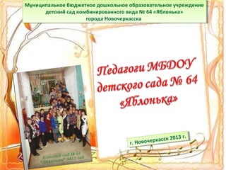 Документ представляет собой список работников муниципального бюджетного дошкольного образовательного учреждения детского сада комбинированного вида № 64 'Яблонька' в Новочеркасске, включая их имена, должности, образование, квалификационные категории и стаж работы. В нем также указаны достижения педагогов и участие в курсах повышения квалификации. Каждый сотрудник имеет уникальный опыт и различные области специализации, отражающие их профессиональную подготовку.