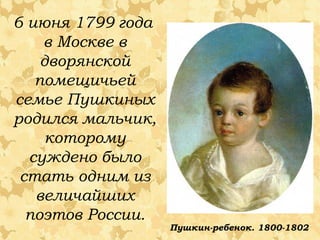 Документ описывает жизнь и творчество Александра Сергеевича Пушкина, одного из величайших поэтов России. Он охватывает его ранние годы, образование в Царскосельском лицее, ссылки, семейную жизнь и смерть в дуэли. Также подчеркивается влияние его окружения, включая семью и друзей, на развитие его творчества.