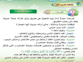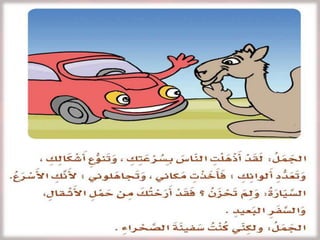 يتناول المستند مقارنة بين وسائل النقل القديمة مثل الجمل ووسائل النقل الحديثة مثل السيارات. يستعرض الاختلافات في السرعة والفوائد، بالإضافة إلى أهمية وسائل النقل الحديثة وتأثيرها على الحياة اليومية. ينتهي النص بتأكيد دور الجمل كوسيلة نقل تقليدية رغم التطورات الحديثة.