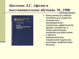 Документ представляет собой обширный обзор литературы по афазии и восстановительному обучению, включая работы различных авторов, которые освещают методы диагностики и коррекции речевых нарушений. Основное внимание уделяется нейропсихологическим, лингвистическим и педагогическим аспектам реабилитации пациентов с афазией и нарушениями, вызванными поражениями головного мозга. Также обсуждаются современные подходы к обучению и восстановлению речевых функций, а также методические рекомендации для практикующих специалистов.