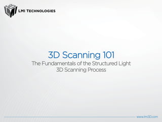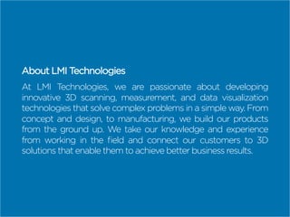 The document provides an overview of structured light 3D scanning technology developed by LMI Technologies, highlighting its applications, workflow, and challenges. It explains the scanning process, including the importance of proper preparation and alignment to achieve accurate results, as well as the differences between structured light and laser scanning. Additionally, it addresses potential restrictions while emphasizing the technology's suitability for complex surfaces and high-speed automation.