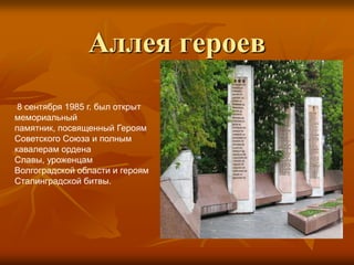 Документ описывает памятники и мемориалы, посвященные сталинградской битве, включая Аллею героев и Дом Павлова, символизирующие героизм и стойкость защитников. Также упоминаются памятные места, такие как руины старой мельницы и панорама размежевания немецко-фашистских войск. Центральным элементом мемориала является монумент 'Родина-мать зовет!', символизирующий призыв к защите Отечества.