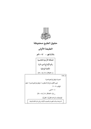 الكتاب "تنوير القلوب في قراءة يعقوب" يؤلفه توفيق إبراهيم ضمرة ويعالج فيه أصول قراءة الإمام يعقوب ويركز على الفروق بينها وبين رواية حفص. يتناول المؤلف الطرق التي استخدمها العلماء في دراسة القراءات القرآنية، ويشجع الطلاب على التعلم عبر الحلقات العلمية. كما يهدف الكتاب إلى تيسير فهم القراءة وتعليمها بأسلوب مبسط.