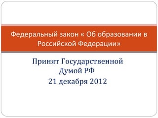 Федеральный закон «Об образовании в Российской Федерации», принят 21 декабря 2012 года, вступает в силу с 1 сентября 2013 года. Закон охватывает организацию курсовой подготовки и повышения квалификации педагогических работников, а также их правовой статус и обязанности по систематическому повышению профессионального уровня. Кроме того, закон включает положения о научно-методической поддержке в образовательных учреждениях.