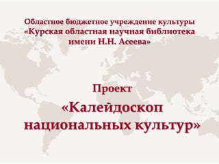 Проект «Калейдоскоп национальных культур» Курской областной научной библиотеки направлен на формирование межэтнической толерантности среди населения региона через информирование о культуре и традициях различных народов. В рамках проекта предусмотрены мероприятия для молодежи, направленные на воспитание дружбы и единства, а также адаптацию представителей разных этносов. Реализация проекта приведет к повышению интереса к национальным традициям и укреплению связей с общественными организациями.