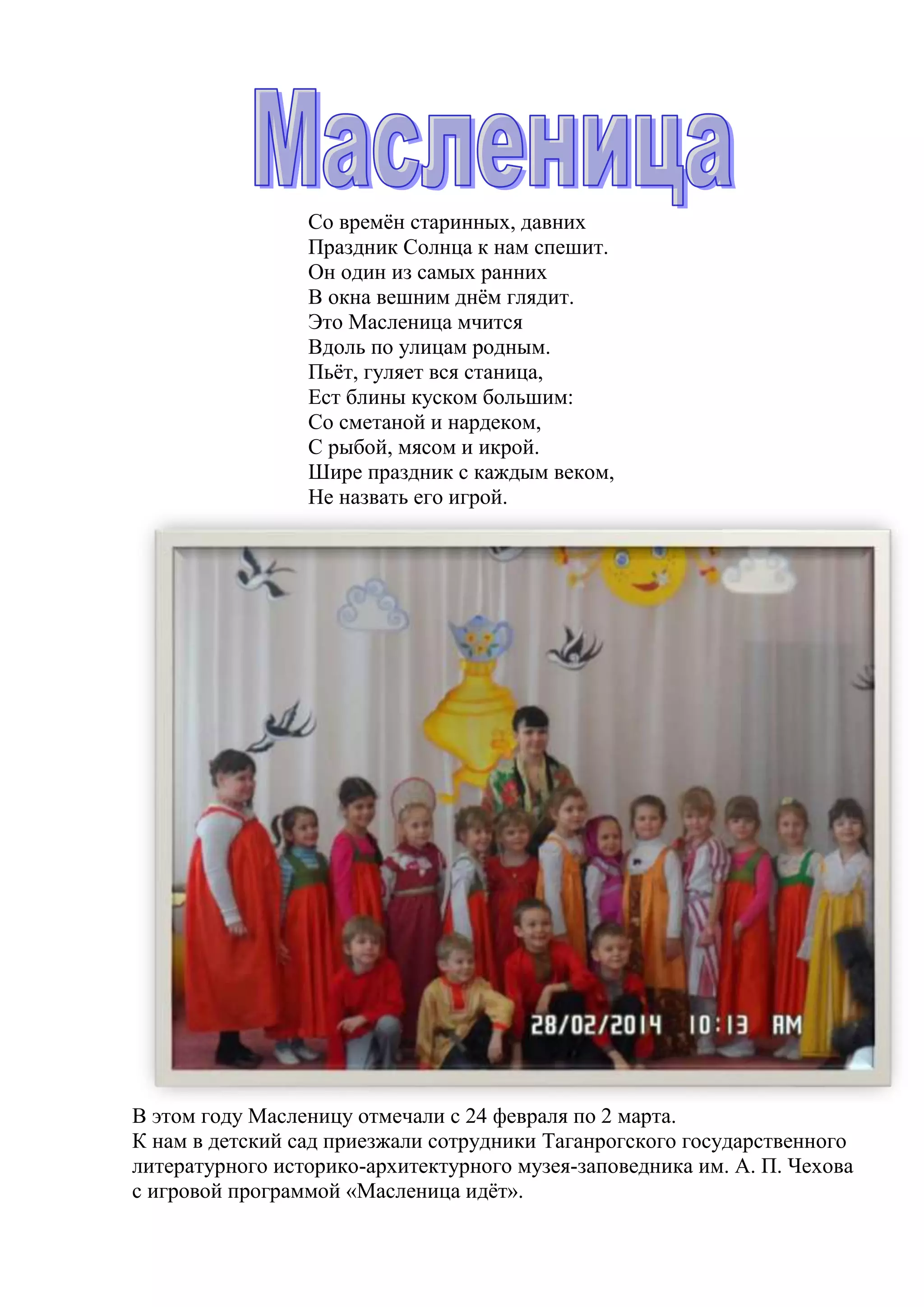 В документе описывается празднование Масленицы в детском саду, которое проходило с 24 февраля по 2 марта. Дети познакомились с историей праздника, участвовали в игровых программах, смотрели видео и искали старинные предметы. Праздник включал в себя песни, стихи, конкурсы и угощение блинами.