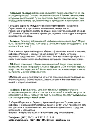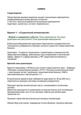 Документ представляет концепцию организации мероприятий для поддержки выхода фильма 'Стартап', включая два варианта: 'студенческий инноваторский' и 'бизнес сообщество – ярмарка достижений'. Оба варианта нацелены на различные аудитории, такие как студенты и местные предприниматели, с планом реализации мероприятий, включая выставки, мастер-классы и показ фильма. Организация предполагает сотрудничество с местными СМИ, блоггерами и стартап-сообществом, а также наличие команды для успешного проведения.