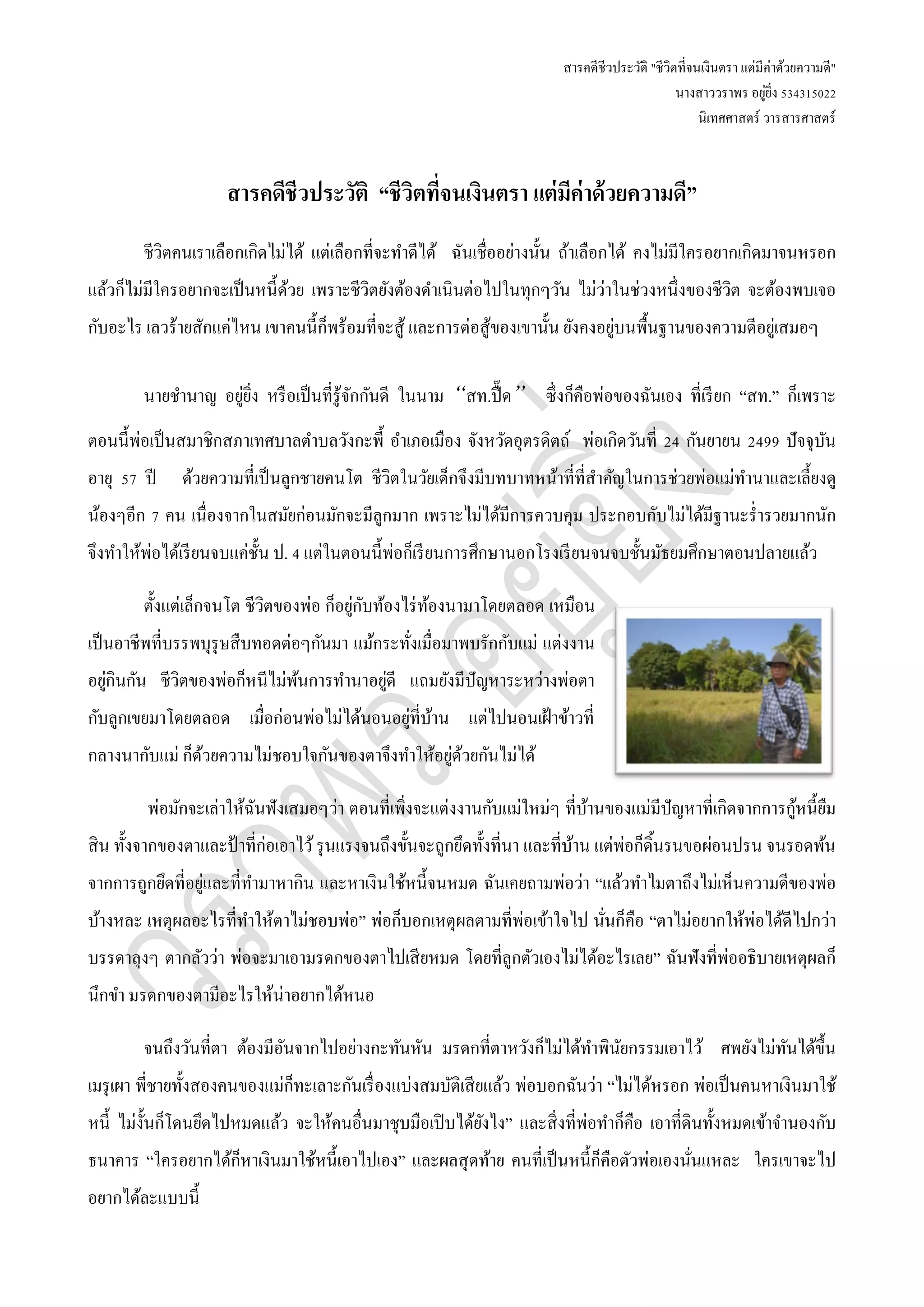 อยู่ยิ่ง 534315022 นิเทศศาสตร์ วารสารศาสตร์ สารคดีชีวประวัติ “ชีวิตที่จนเงินตรา แต่มีค่าด้วยความดี” ชีวิตคนเราเลือกเกิดไม่ได้ แต่เลือกที่จะทาดีได้ ฉันเชื่ออย่างนั้น ถ้าเลือกได้ คงไม่มีใครอยากเกิดมาจนหรอก แล้วก็ไม่มีใครอยากจะเป็นหนี้ด้วย เพราะชีวิตยังต้องดาเนินต่อไปในทุกๆวัน ไม่ว่าในช่วงหนึ่งของชีวิต จะต้องพบเจอ กับอะไร เลวร้ายสักแค่ไหน เขาคนนี้ก็พร้อมที่จะสู้ และการต่อสู้ของเขานั้น ยังคงอยู่บนพื้นฐานของความดีอยู่เสมอๆ นายชานาญ อยู่ยิ่ง หรือเป็นที่รู้จักกันดี ในนาม “สท.ปื๊ด” ซึ่งก็คือพ่อของฉันเอง ที่เรียก “สท.” ก็เพราะ ตอนนี้พ่อเป็นสมาชิกสภาเทศบาลตาบลวังกะพี้ อาเภอเมือง จังหวัดอุตรดิตถ์ พ่อเกิดวันที่ 24 กันยายน 2499 ปัจจุบัน อายุ 57 ปี ด้วยความที่เป็นลูกชายคนโต ชีวิตในวัยเด็กจึงมีบทบาทหน้าที่ที่สาคัญในการช่วยพ่อแม่ทานาและเลี้ยงดู น้องๆอีก 7 คน เนื่องจากในสมัยก่อนมักจะมีลูกมาก เพราะไม่ได้มีการควบคุม ประกอบกับไม่ได้มีฐานะร่ารวยมากนัก จึงทาให้พ่อได้เรียนจบแค่ชั้น ป. 4 แต่ในตอนนี้พ่อก็เรียนการศึกษานอกโรงเรียนจนจบชั้นมัธยมศึกษาตอนปลายแล้ว ตั้งแต่เล็กจนโต ชีวิตของพ่อ ก็อยู่กับท้องไร่ท้องนามาโดยตลอด เหมือน เป็นอาชีพที่บรรพบุรุษสืบทอดต่อๆกันมา แม้กระทั่งเมื่อมาพบรักกับแม่ แต่งงาน อยู่กินกัน ชีวิตของพ่อก็หนีไม่พ้นการทานาอยู่ดี แถมยังมีปัญหาระหว่างพ่อตา กับลูกเขยมาโดยตลอด เมื่อก่อนพ่อไม่ได้นอนอยู่ที่บ้าน แต่ไปนอนเฝ้าข้าวที่ กลางนากับแม่ ก็ด้วยความไม่ชอบใจกันของตาจึงทาให้อยู่ด้วยกันไม่ได้ พ่อมักจะเล่าให้ฉันฟังเสมอๆว่า ตอนที่เพิ่งจะแต่งงานกับแม่ใหม่ๆ ที่บ้านของแม่มีปัญหาที่เกิดจากการกู้หนี้ยืม สิน ทั้งจากของตาและป้าที่ก่อเอาไว้รุนแรงจนถึงขั้นจะถูกยึดทั้งที่นา และที่บ้าน แต่พ่อก็ดิ้นรนขอผ่อนปรน จนรอดพ้น จากการถูกยึดที่อยู่และที่ทามาหากิน และหาเงินใช้หนี้จนหมด ฉันเคยถามพ่อว่า “แล้วทาไมตาถึงไม่เห็นความดีของพ่อ บ้างหละ เหตุผลอะไรที่ทาให้ตาไม่ชอบพ่อ” พ่อก็บอกเหตุผลตามที่พ่อเข้าใจไป นั่นก็คือ “ตาไม่อยากให้พ่อได้ดีไปกว่า บรรดาลุงๆ ตากลัวว่า พ่อจะมาเอามรดกของตาไปเสียหมด โดยที่ลูกตัวเองไม่ได้อะไรเลย” ฉันฟังที่พ่ออธิบายเหตุผลก็ นึกขา มรดกของตามีอะไรให้น่าอยากได้หนอ จนถึงวันที่ตา ต้องมีอันจากไปอย่างกะทันหัน มรดกที่ตาหวังก็ไม่ได้ทาพินัยกรรมเอาไว้ ศพยังไม่ทันได้ขึ้น เมรุเผา พี่ชายทั้งสองคนของแม่ก็ทะเลาะกันเรื่องแบ่งสมบัติเสียแล้ว พ่อบอกฉันว่า “ไม่ได้หรอก พ่อเป็นคนหาเงินม