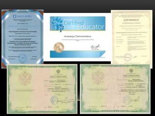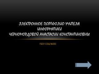 Документ представляет собой электронное портфолио учителя информатики Анастасии Константиновны Черномордовой, в котором содержатся сведения о ее образовании, профессиональном стаже и публикациях. Она имеет высшее образование и квалификационную категорию 'молодой специалист', активно участвует в внеклассной работе и организации научных конкурсов в школе. Портфолио также включает информацию о повышении квалификации и внедрении информационных технологий в образовательный процесс.