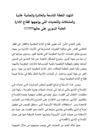 تتناول الوثيقة التحديات الراهنة التي تواجه القطاع الحكومي في مجال الإدارة والتنمية، مشيرةً إلى نقص الكفاءة والفعالية والتحديات التنظيمية. تؤكد على أهمية إصلاح الآليات الحكومية لتعزيز الأداء وتحقيق التنمية المستدامة. كما تسلط الضوء على ضرورة تحسين التعاون بين الجهات الحكومية لتعزيز النتائج والإنتاجية.