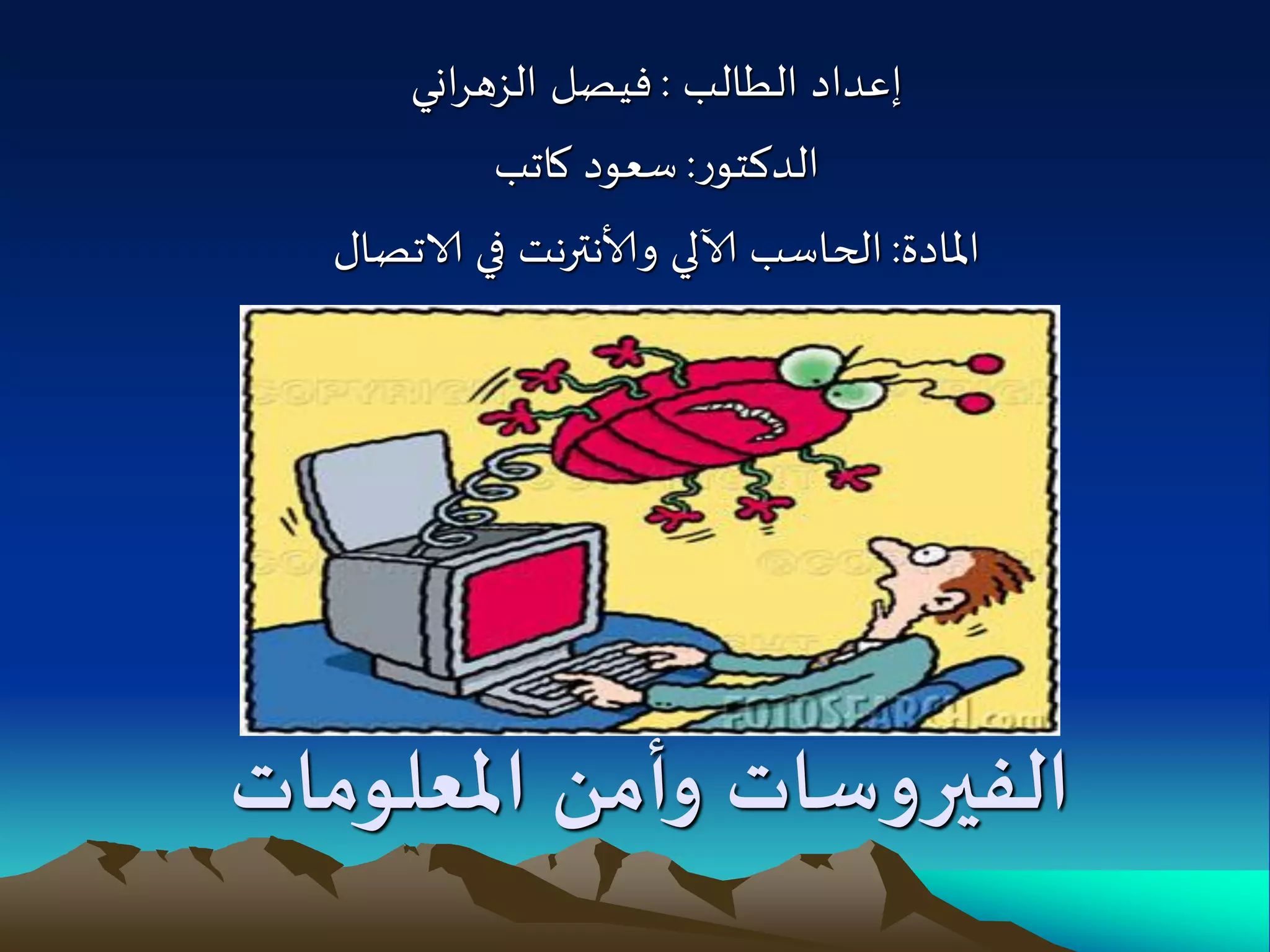 يستعرض الوثيقة أنواع فيروسات الكمبيوتر، أسبابها، أعراض الإصابة بها، وكيفية الحماية منها. يتطرق المحتوى إلى الدوافع وراء إنشاء هذه الفيروسات وأساليب انتشارها، بالإضافة إلى العلامات التي تدل على وجودها في الأنظمة. كما تتضمن الوثيقة إجراءات ممكنة لحذف الفيروسات والتعامل معها.