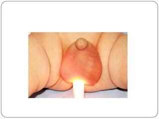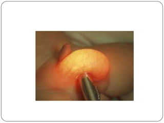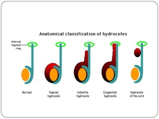 Hydrocele is a collection of fluid within the processus vaginalis that causes swelling in the scrotum. It is usually caused by a failure of the processus vaginalis to completely fuse during development. Hydroceles can be communicating or non-communicating depending on whether the processus vaginalis remains open to the abdominal cavity. The standard treatment is surgical repair to prevent the fluid from reaccumulating. Surgery involves ligating and removing the hydrocele sac to restore normal drainage from the scrotum. Complications are rare if the surgery is performed properly.