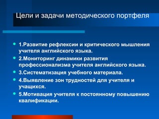 Документ представляет портфолио учителя английского языка, в котором описаны цели, задачи и содержание методического портфеля, включая педагогическую и научно-методическую деятельность. Учитель акцентирует внимание на развитии рефлексии, критического мышления, мотивации и внедрении интерактивных методов обучения. Кроме того, представлено обширное описание учебно-материальной базы и участия в воспитательных мероприятиях.