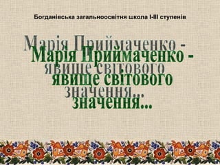«Добрі люди ідобрі звірі» Народна художниця України, лауреат Державної премії України ім.. Т.Г. Шевченка Марія Приймаченко своєю творчістю відкрила оригінальну сторінку самобутнього мистецтва світової культури. Її виставки з великим успіхом експонувалися у Франції, Канаді, Польщі, Росії, Німеччині та багатьох інших країнах світу. У 1937 році на всесвітній виставці в Парижі Марія Приймаченко отримала золоту медаль, здивувавши своїми картинами мистецький світ ...