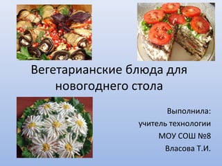 Документ содержит рецепты вегетарианских блюд для новогоднего стола, включая овощное ассорти, фаршированные шампиньоны, фруктовый салат и многие другие. Каждое блюдо описано по ингредиентам и этапам приготовления, что облегчает следование инструкциям. Рецепты предлагают разнообразие вкусов и представления блюд для праздничного стола.