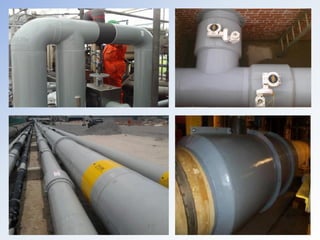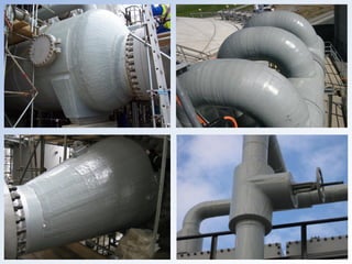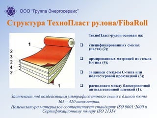 Документ описывает материалы 'технопласт' и 'fibaroll', предназначенные для усиления и защиты трубопроводов, оборудования и резервуаров от коррозии, химических воздействий и воздействия окружающей среды. Эти фотополимерные материалы обеспечивают высокую механическую прочность и стойкость к различным химическим веществам, соответствуя стандартам ISO 9001:2000. Рекомендуется применение данных покрытий в различных отраслях, включая нефтяную, для восстановления и защиты инфраструктуры.