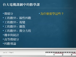 本文件讨论了电机工程学中数学的重要性,强调了学生在学习过程中应具备扎实的基本功和竞争力。内容涵盖微积分、线性代数、微分方程等课程,并阐述了每门课程的目标和应用。最终,文档还提到工程师需以数学和程序创新应对实际问题。