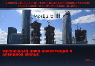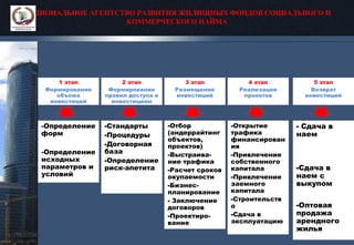 Документ описывает жизненный цикл инвестиций в арендное жилье, выделяя пять основных этапов: формирование объема инвестиций, правила доступа, размещение, реализацию проектов и возврат инвестиций. Также рассматриваются варианты возврата инвестиций, включая сдачу в наем, аренду с выкупом и оптовую продажу. Приведены плюсы и минусы каждого варианта с оценкой мультипликативных эффектов от инвестиций.