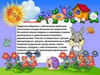 Презентация освещает важность взаимодействия воспитателей и родителей в совместной физической активности детей. Акцентируется на необходимости поддержки родителей в организации физкультурных и игровых занятий, так как многие из них испытывают трудности в этом. Используются различные формы работы с родителями, включая совместные развлечения и физические досуги, для создания положительной атмосферы и улучшения здоровья детей.