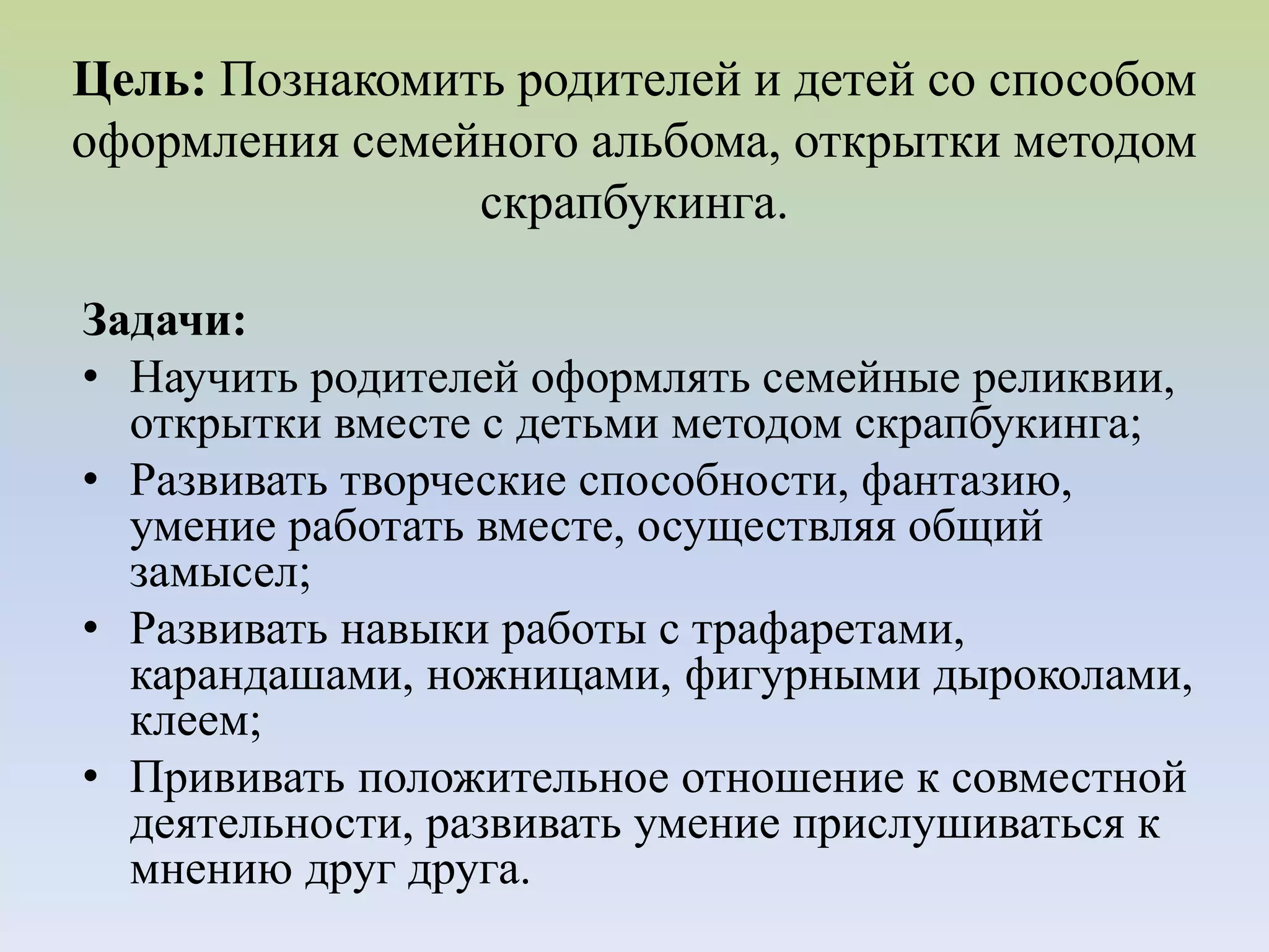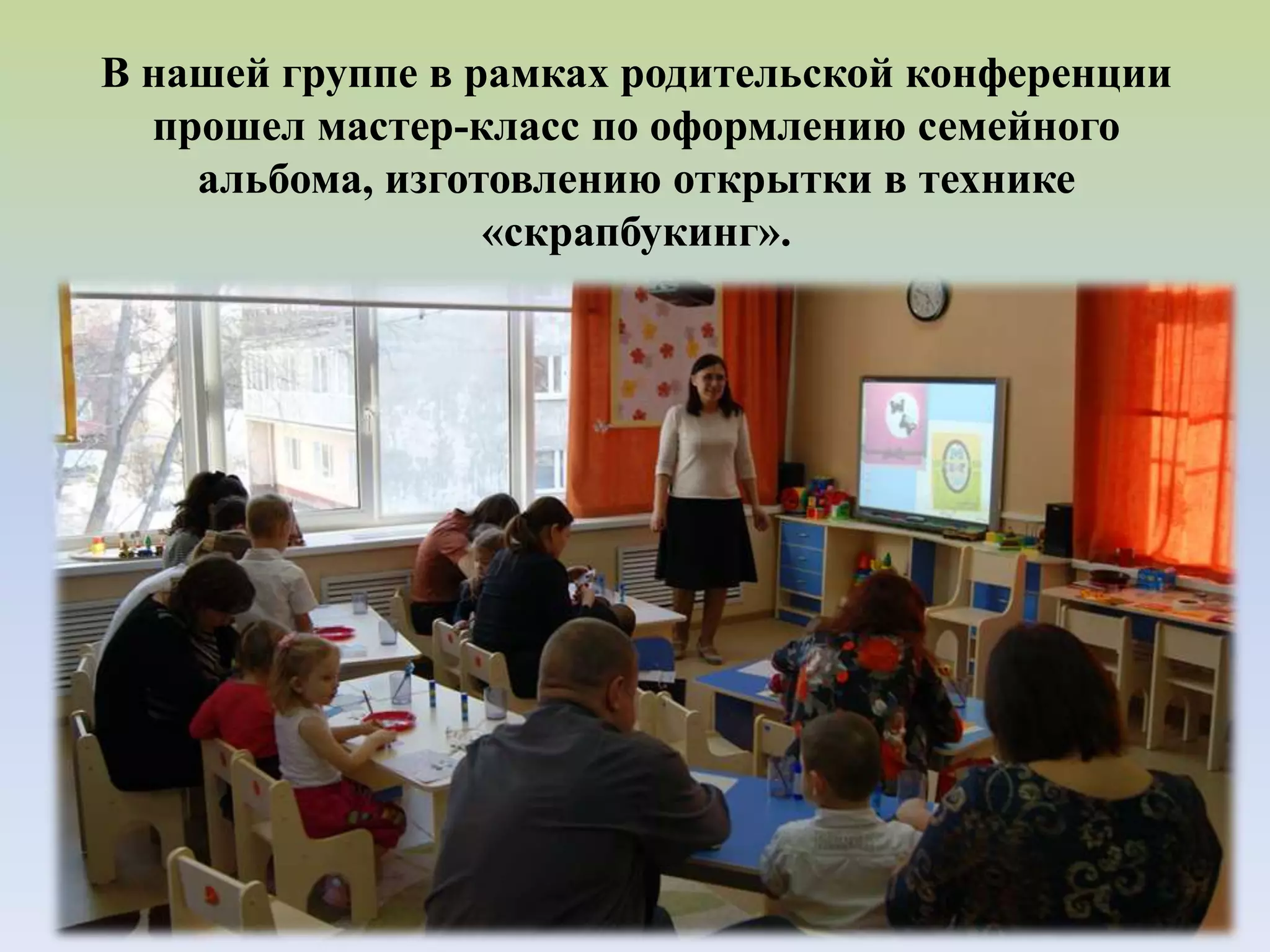 В рамках родительской конференции прошел мастер-класс по оформлению семейного альбома и открытки в технике скрапбукинга, целью которого было ознакомление родителей и детей с этим методом. Участники научились оформлять реликвии и развивать творческие способности, работая вместе и используя различные инструменты и материалы. Скрапбукинг включает создание оригинальных альбомов с использованием шаблонов и различных декоративных элементов.
