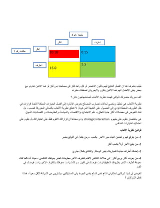 تتناول الوثيقة نظرية الألعاب كأسلوب لتحليل التفاعلات الاستراتيجية بين الأفراد، مما يساعد على اتخاذ قرارات مستنيرة في ظل ظروف متضاربة. تشمل النقاط الرئيسية كيفية تأثير قرارات الأفراد على النتائج المتوقعة وعلاقتها مع التوازن بين الأرباح والخسائر. كما تسلط الضوء على أهمية التعاون والتنسيق بين الشركات للحصول على مكاسب أكبر.