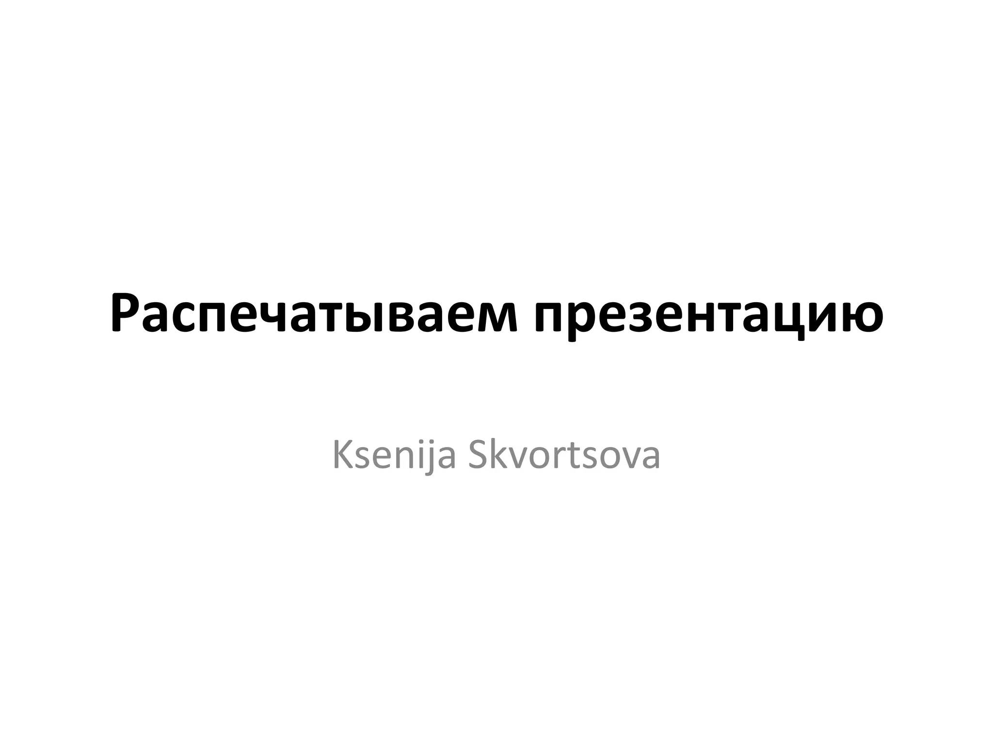Документ описывает процесс печати презентации Ксении Скворцовой, включая выбор подходящего принтера (чернильный, лазерный или струйный). Он также охватывает настройки печати, такие как формат раздаточного материала и печать заметок докладчика. В завершение упоминается возможность повторного просмотра и редактирования презентации.