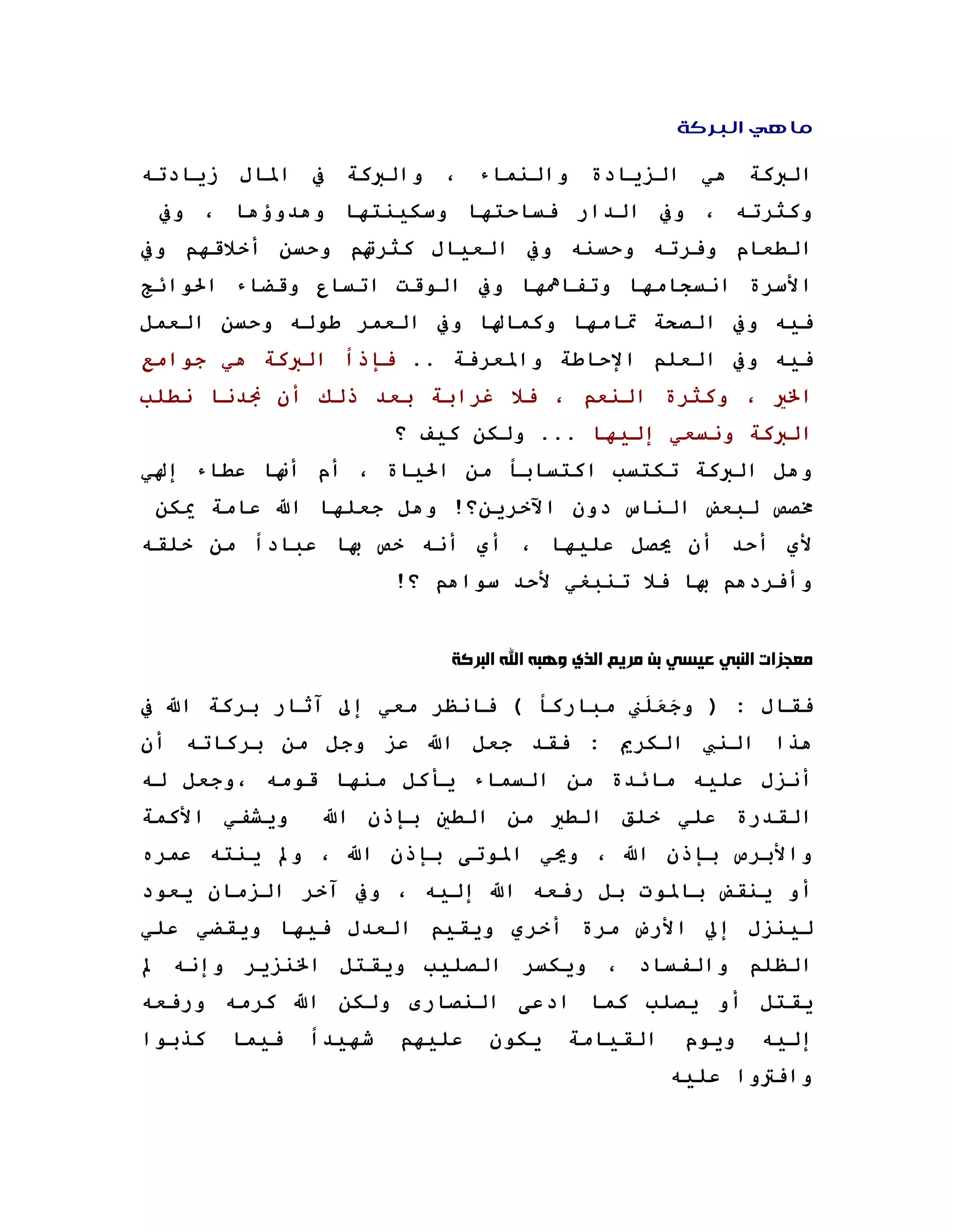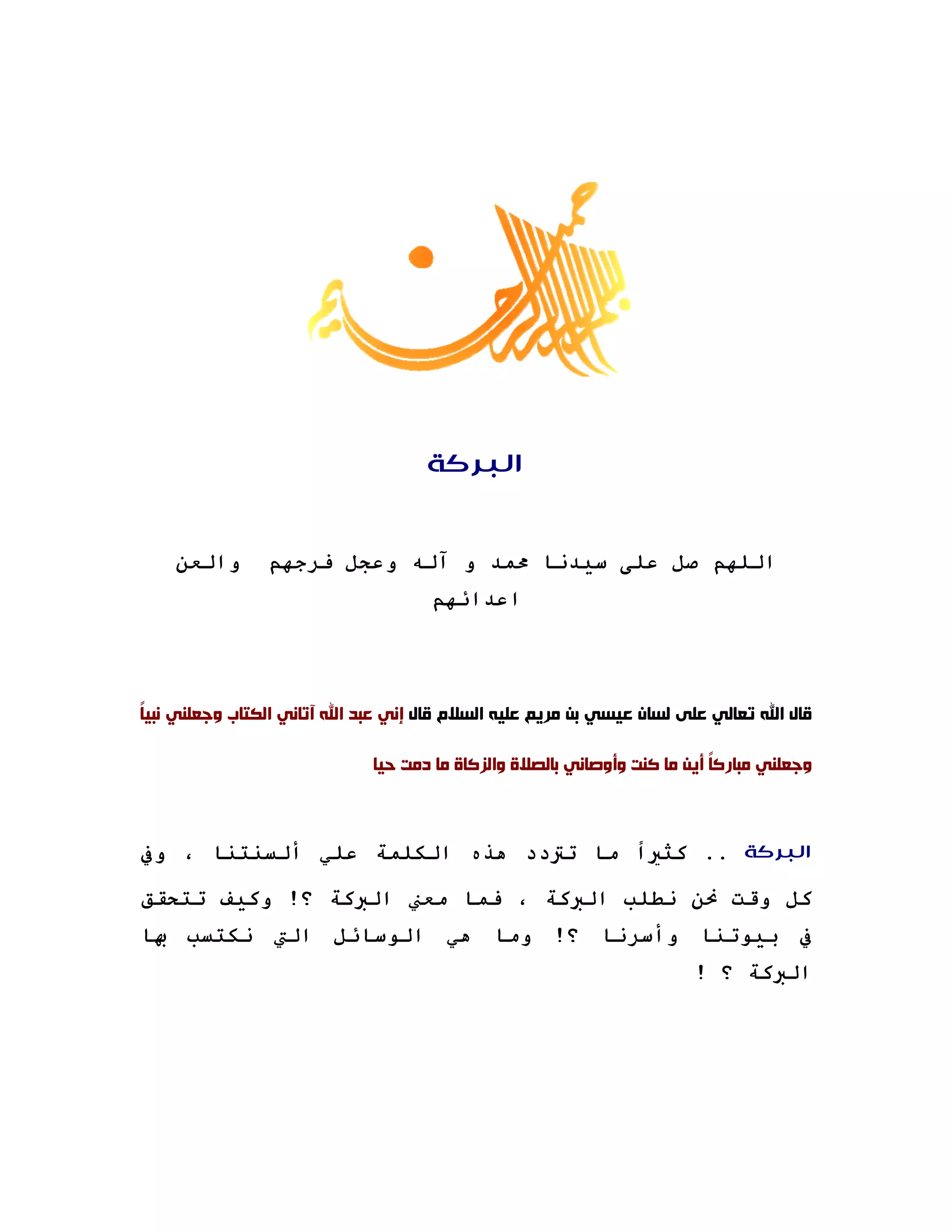 تناقش الوثيقة مفهوم البركة وأسباب تحقيقها في الحياة اليومية، مع التركيز على أهميتها في مختلف جوانب الحياة مثل المال، الأسرة، والوقت. تتضمن النصوص الدينية التي تربط بين البركة وتقوى الله، مشددة على أهمية الشكر والصلاة والأعمال الصالحة كوسائل لجلب البركة. كما تشير إلى أمثلة من التاريخ والنصوص المقدسة التي تعزز فكرة البركة كعطاء إلهي يمكن للجميع السعي لتحقيقه.