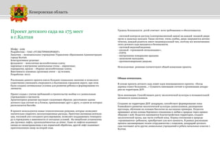 Документ содержит описание проектов строительства детских садов в Кемеровской области, включая детский сад на 175 мест в г. Калтан и другие садики с высокой социальной значимостью. Все проекты обеспечивают современные условия обучения и безопасности для детей, а также включают экологические инициативы, такие как создание дендрария и сенсорных комнат. Проекты созданы с учетом современных технологий и стандартов, что позволяет эффективно использовать ресурсы и сокращать эксплуатационные расходы.