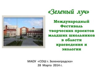 Фестиваль 'Зеленый луч' посвящен творческим проектам младших школьников в сферах краеведения и экологии. Мероприятие организовано МАОУ 'СОШ г. Зеленоградска'. Фестиваль состоялся 28 марта 2014 года.