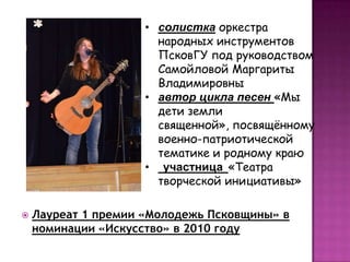 Студентка пятого курса Псковского государственного университета, активно занимающаяся вокалом и авторским творчеством, является лауреаткой множества конкурсных наград в области искусства. Она автор песен на военно-патриотическую тематику и участница многочисленных фестивалей и конкурсов на региональном и международном уровнях. Также она активно участвует в культурной деятельности в своем университете и городе, имея в своем активе более 180 концертов за три года.