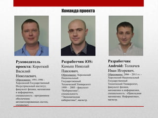 Документ представляет проект мобильного приложения тревожной кнопки, разработанного командой специалистов с высшим образованием в области информационных технологий. Приложение предназначено для быстрого вызова помощи в экстренных ситуациях и включает в себя три модуля для пользователей, охранных служб и диспетчеров. Основная цель проекта – обеспечить безопасность граждан и развивать рынок услуг негосударственных охранных предприятий в Украине и за рубежом.