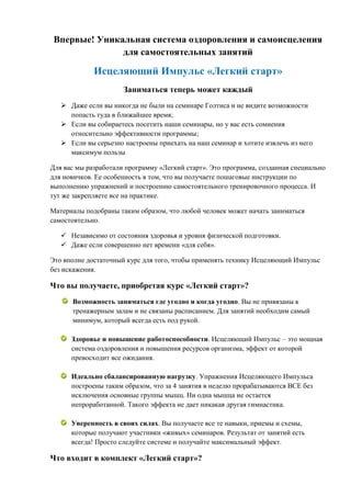 Документ представляет курс «легкий старт», уникальную систему оздоровления и самоисцеления, созданную для новичков, которые хотят заниматься самостоятельно с использованием пошаговых инструкций и минимального оборудования. Курс включает материалы, такие как DVD-диски и методички, и предоставляет возможность заниматься в любое время и в любом месте, настраивая нагрузку в зависимости от уровня подготовки. Обещается высокая эффективность, возможность вернуть деньги в случае недовольства и получение постоянной онлайн-поддержки от инструкторов.