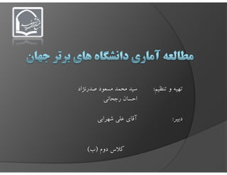 This document discusses university ranking systems and factors. It notes that as science and technology advance globally, standardized methods are needed to measure the academic standing of educational institutions. University rankings are conducted based on various parameters and can measure quality based on existing indicators such as statistics on faculty, students, scholarships, and admissions. Additional rankings also exist for specific academic programs, departments, and schools. University rankings provide a framework for comparison and help guide decisions.