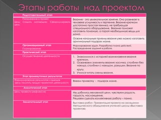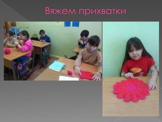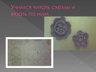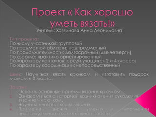Документ описывает проект по обучению вязанию крючком, начиная с подготовки и формулирования целей, включая освоение основных техник вязания и обучение чтению схем. В ходе проекта будет создана прихватка в качестве подарка для мамы, а также подготовлено коллективное панно. Заключительный этап включает презентацию работ на методическом объединении и обсуждение исторического контекста развития вязания в разных культурах.