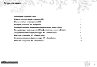 Документ описывает круглый стол по созданию индустриальных парков в Днепропетровской области, включая участников, стратегические цели и мировую практику. Основное внимание уделяется истории развития индустриальных парков в Украине и государственным механизмам привлечения инвестиций, а также площадкам для их размещения. В документе также представлены шаги по созданию индустриальных парков в Павлограде и Кривом Роге.