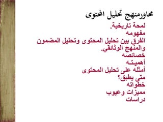 تتناول الوثيقة تحليل المحتوى كمنهجية بحثية لفهم المعلومات في الوثائق، حيث تسلط الضوء على خصائصه وأهميته وعناصره الأساسية. كما تناقش الوثيقة تطبيقاته ومراحل تنفيذه، بالإضافة إلى مزاياه وعيوبه. تشير أيضًا إلى دراسة تحليلية لمحتوى كتب القراءة في الكويت ومدى تضمينها لقيم المواطنة.