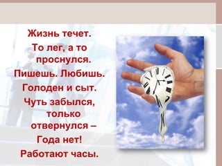 Документ описывает основы тайм-менеджмента, акцентируя внимание на важности эффективности использования времени и управления им. Рассматриваются основные техники и правила, такие как планирование, определение приоритетов и делегирование задач, а также выделение хронофагов, мешающих эффективной работе. В заключение подчеркивается, что время – это главное богатство человека, и правильное управление им ведет к успеху в жизни.