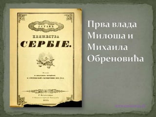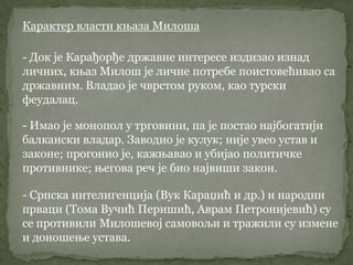 О карактеру Милошеве владавине, сукобу са српским првацима и бунама против њега, Сретењском уставу, Турском уставу, влади Михаила, изгнанствима Милоша и Михаила.