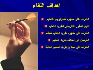 تناقش الوثيقة مفهوم تفريد التعليم وتطور تكنولوجيا التعليم، موضحة الأهداف والمبادئ الأساسية لتفريد التعليم كوسيلة لتحسين العملية التعليمية. تركز على أهمية الفروق الفردية بين الطلاب، وضرورة استخدام استراتيجيات تعليمية ملائمة لكل طالب لتحقيق النجاح الأكاديمي. كما تستعرض المراحل التاريخية لتفريد التعليم وتطور أساليب التعلم الفردي ودوره في تعزيز تجربة التعلم.