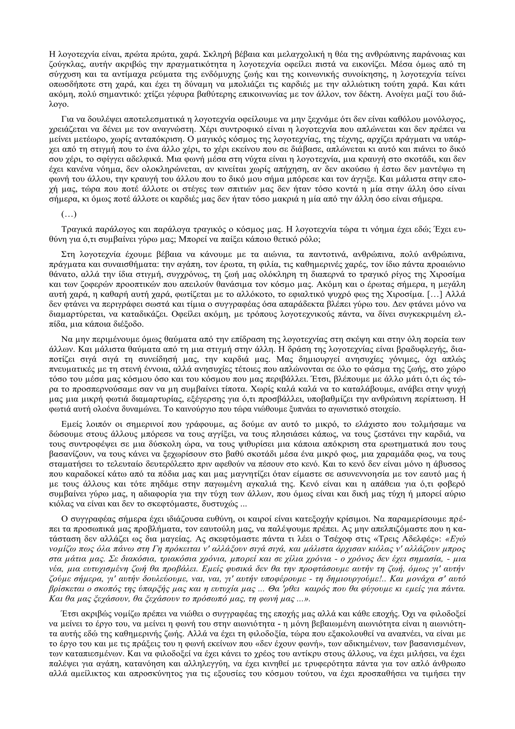 σου χέρι, το σφίγγει αδελφικά. Μια φωνή µέσα στη νύχτα είναι η λογοτεχνία, µια κραυγή στο σκοτάδι, και δεν