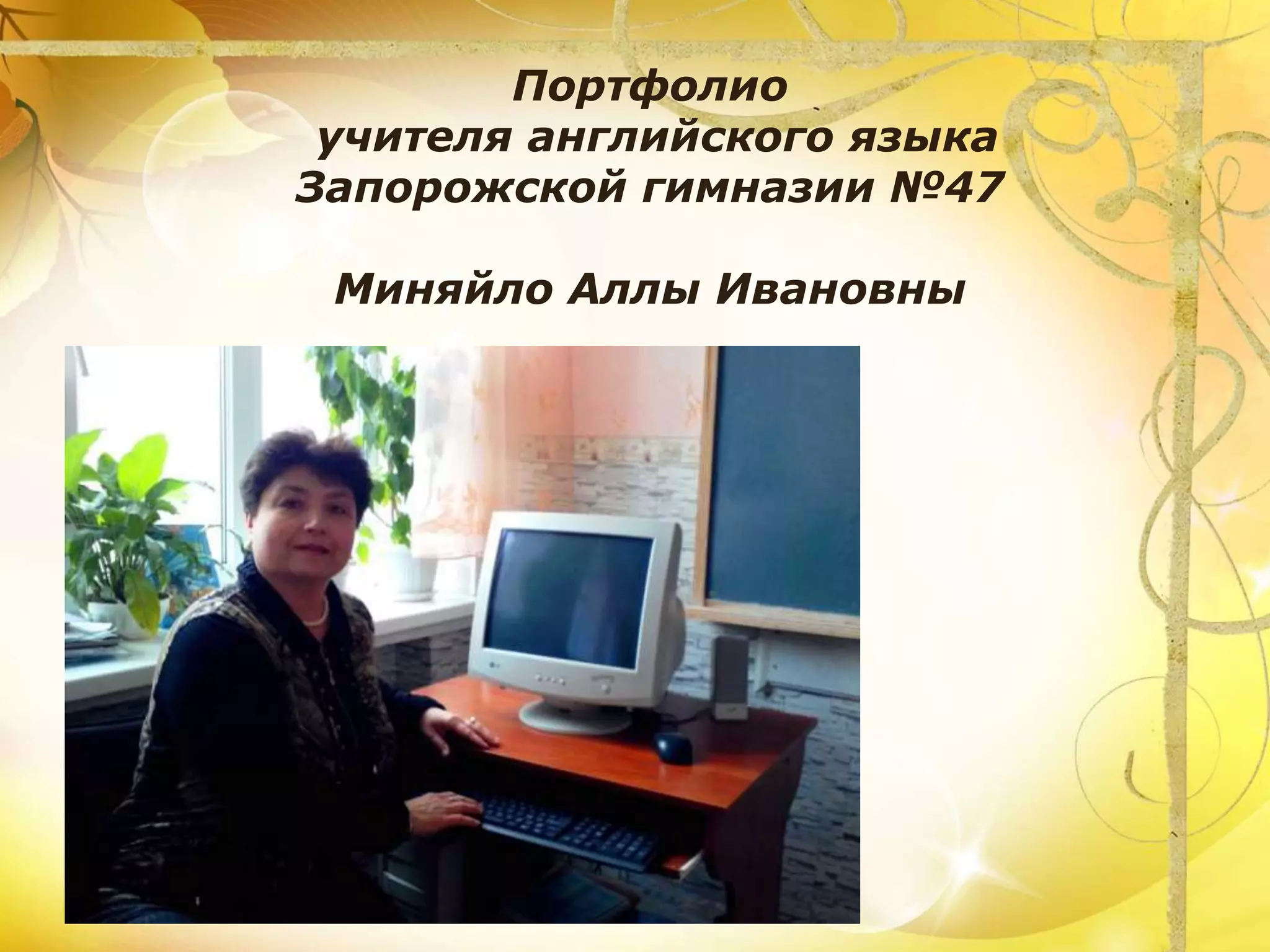 В портфолио учителя английского языка Аллы Ивановны Миняйло представлены ее педагогические кредо, опыт работы и достижения учащихся на различных всеукраинских конкурсах. Основное внимание уделено методам обучения говорению, которые способствуют повышению мотивации и развитию коммуникативных умений у студентов. Портфолио также включает статистику результативности учебной деятельности классов за несколько учебных годов.