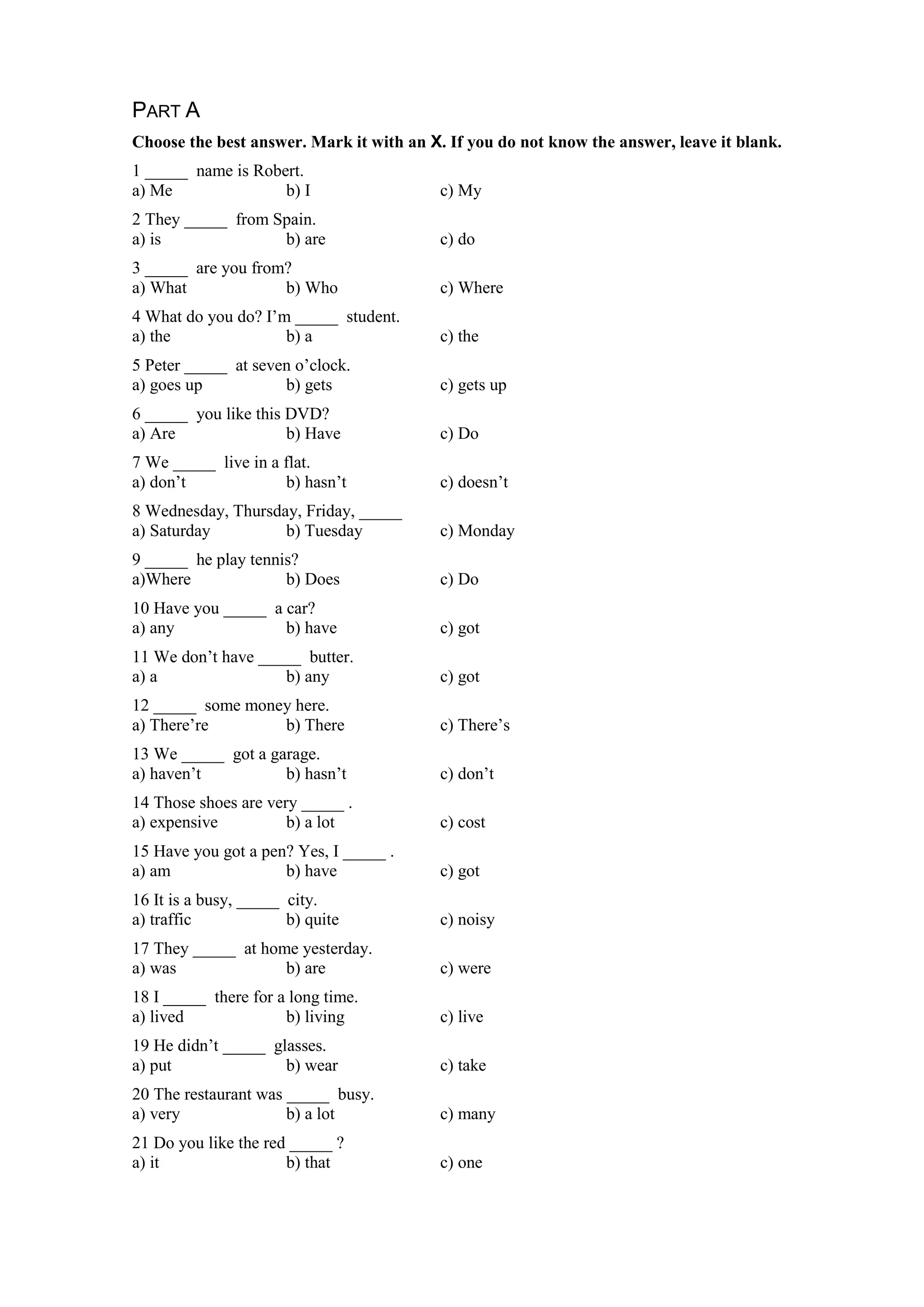 1. The document contains a series of questions testing grammar knowledge. The questions cover topics such as verbs, pronouns, prepositions, adjectives and adverbs.