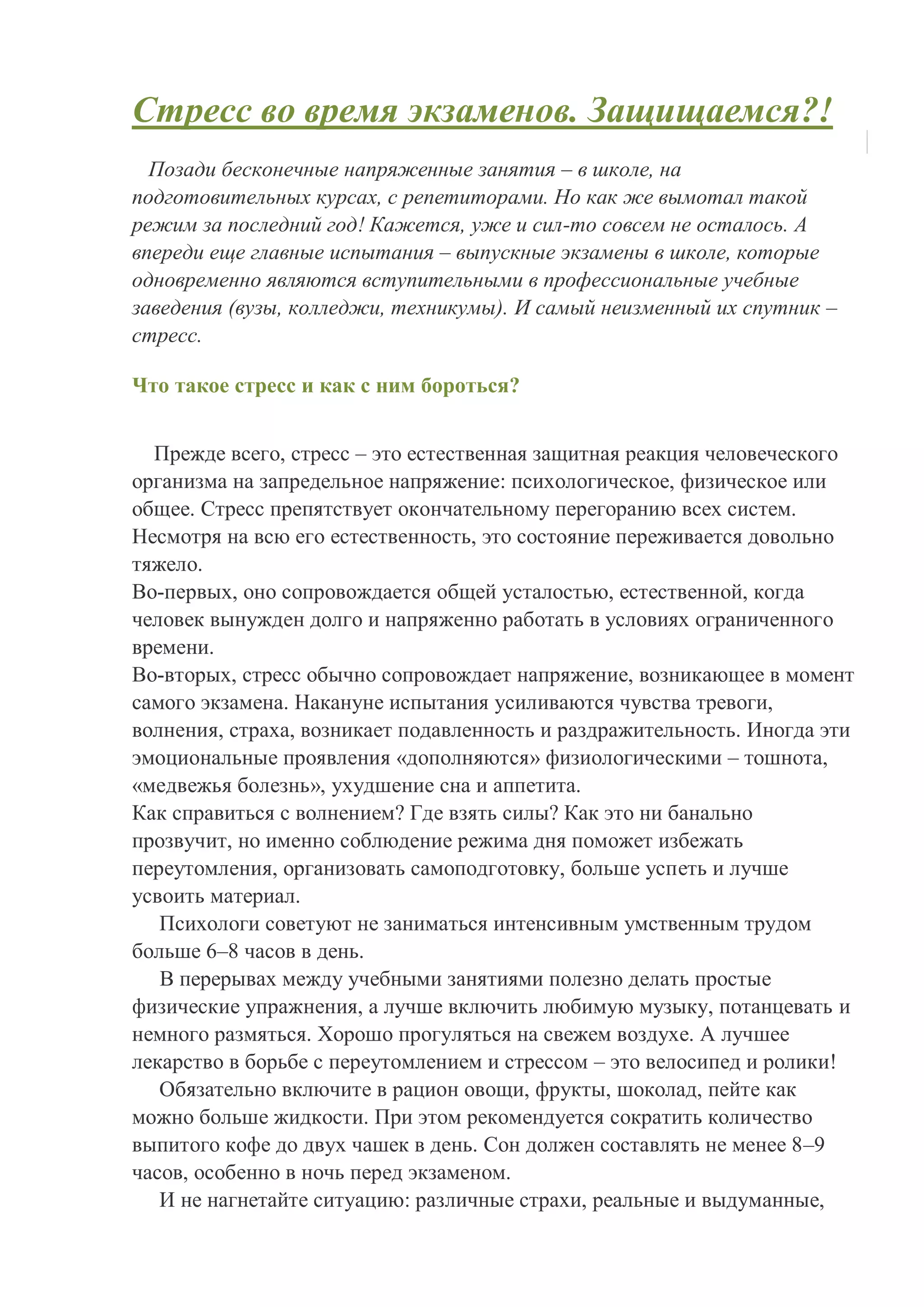 Документ обсуждает стресс во время экзаменов и предлагает способы борьбы с ним, подчеркивая важность режима дня и физической активности. Он описывает, как стресс может быть как негативным, так и положительным, способствуя сосредоточению и улучшению учебных результатов. Включены расслабляющие упражнения и советы по укреплению психоэмоционального состояния перед важными испытаниями.