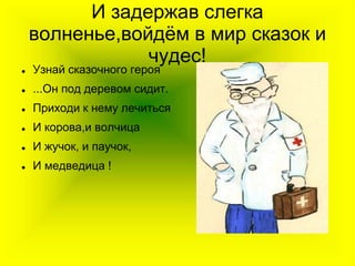 Документ представляет собой презентацию на тему 'математика вокруг нас', где используются сказочные элементы для объяснения математических задач. Презентация включает различные задачи, относящиеся к математике, такие как расчёт расстояний, масс и количеств, оформленные в виде сказочных историй. Учитель предлагает ученикам решить задачи, чтобы помочь доктору Айболиту в лечении животных и вдохновляет на изучение математики через творчество.
