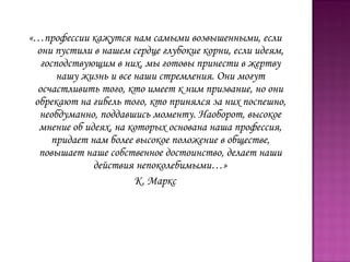 Документ описывает различные профессии, их требования, плюсы и минусы. Он подчеркивает важность выбора подходящей профессии с учетом критериев, таких как интерес, квалификация и уровень заработной платы. Среди рассмотренных профессий - программист, экономист, корректор, переводчик и топограф, каждая из которых имеет свои уникальные особенности и востребованность на рынке труда.