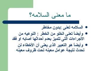 تناقش المحاضرة مفهوم سلامة المرضى وأهمية تقليل الأخطاء الطبية التي قد تؤثر على صحة المرضى أثناء الإجراءات الطبية. تشمل الأخطاء الطبية القابلة للتجنب نتيجة لعوامل بشرية أو نظامية، وتُظهر الإحصائيات أن نسبة حدوثها ترتفع بشكل ملحوظ. لتقليل هذه الأخطاء، يُوصى بتطبيق نظم الجودة الشاملة والدعم الإلكتروني في الرعاية الطبية.